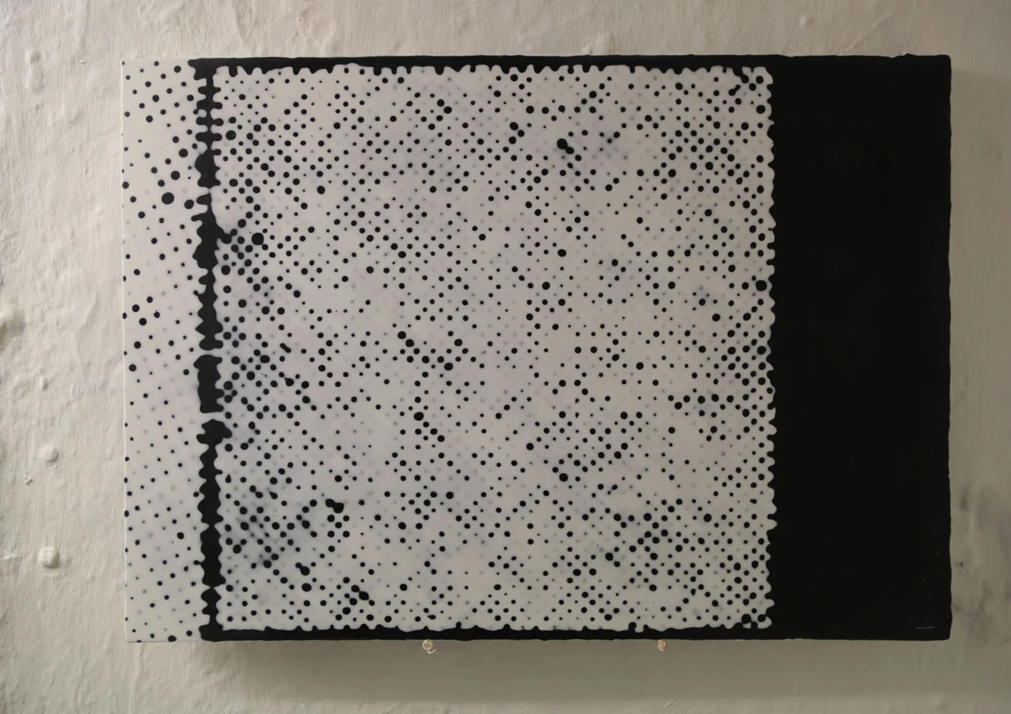 This is the first time that I have experimented with adding a 3D surface to the surface. It's a painting of the glue that sticks tabs together and which sometimes occludes the registration marks. A celebration of the minor essentials that help to construct the everyday items that embellish the products we consume.
